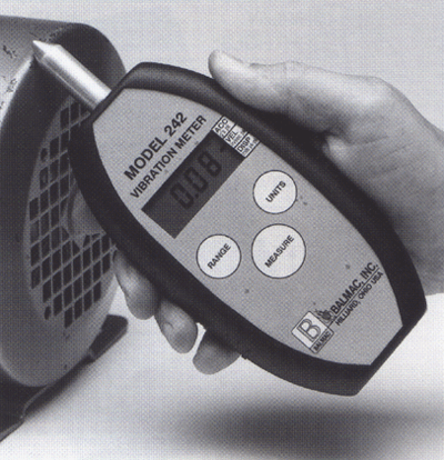 DEscRIPTION The Model 242 Pocket Vibration Meter is a small, portable vibration meter for checking vibration on all types of rotating machinery including fans, pumps, motors, blowers, compressors, and other types of machines. The Model 242 Meter and vibration sensor are contained in a single, hand-held high-impact polystyrene unit. The operator simply selects displacement(mils), velocity(ips) or acceleration (g's) and begins taking measurements. The meter will hold the displayed reading for 60 seconds to allow time for the operator to read it. An automatic shut off feature shuts the meter off after one minute when the meter is mot in use. This feature conserves battery life.